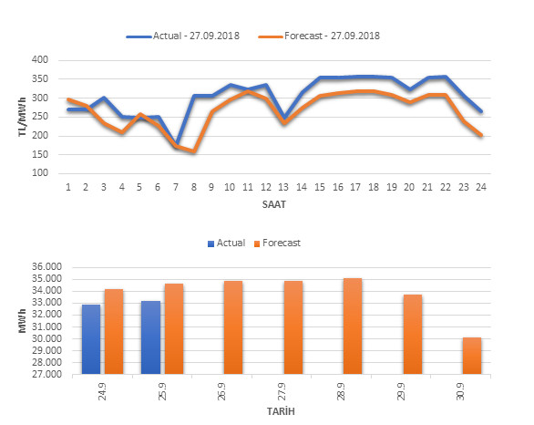 Tahminleme Modeli* analizi sonucu ortalama piyasa takas fiyatı 267,61 TL/MWh ve ortalama tüketim 34.901 MWh olarak öngörülmektedir. Modelin piyasa takas fiyatına dair başarı oranı günlük % 73, tüketime dair başarı oranı ise günlük % 96 olarak hesaplanırken, bugüne kadar yapılan piyasa takas fiyatına dair analizlere göre başarı oranı % 80, tüketime dair başarı oranı ise % 92 olarak hesaplanmaktadır. Saatlik yarın için oluşan ve tahmin edilen piyasa takas fiyatları ile haftalık bazda tahmin edilen ve gerçekleştikçe yer alacak günlük ortalama tüketim değerleri aşağıdaki grafiklerde yer almaktadır.