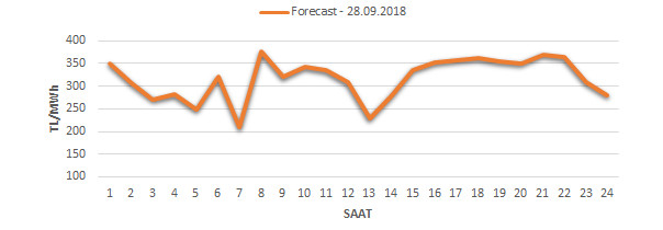 Yarından sonraki gün için oluşacak ortalama piyasa takas fiyatı 318,39 TL/MWH olarak tahmin edilmektedir. Buna bağlı olarak günün maksimum fiyatı 377,40 TL/MWh olarak 07:00 – 08:00 saat aralığında, minimum fiyatı 210,57 TL/MWh olarak 06:00 – 07:00 saat aralığında gerçekleşeceği öngörülmektedir. Puant saatlerde (17:00 – 22:00) tahmini ortalama piyasa takas fiyatı ise 352,83 TL/MWh olarak hesaplanabilmektedir. Saatlik oluşacak piyasa takas fiyatı tahminleri aşağıdaki grafikte yer almaktadır.
