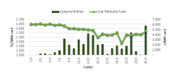 Organize Toptan Doğal Gaz Satış Piyasası (OTSP) dahilinde 01.09.2018 – 25.09.2018 tarihleri arası ortalama Gaz Referans Fiyatı (GRF) 1.582,07 TL/1000 sm3 olarak belirlenirken, aynı tarihler arasında toplam gerçekleşen eşleşmelerin miktarı ise 44.337 x1000 sm3 olarak belirlendi. İlgili tarihler arasında günlük Gaz Referans Fiyatı (GRF) ile Eşleşme Miktarı verileri aşağıdaki grafikte yer almaktadır.
