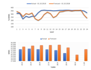Tahminleme Modeli* analizi sonucu ortalama piyasa takas fiyatı 306,37 TL/MWh ve ortalama tüketim 32.886 MWh olarak öngörülmektedir. Modelin piyasa takas fiyatına dair başarı oranı günlük % 59, tüketime dair başarı oranı ise günlük % 91 olarak hesaplanırken, bugüne kadar yapılan piyasa takas fiyatına dair analizlere göre başarı oranı % 80, tüketime dair başarı oranı ise % 95 olarak hesaplanmaktadır. Saatlik yarın için oluşan ve tahmin edilen piyasa takas fiyatları ile haftalık bazda tahmin edilen ve gerçekleştikçe yer alacak günlük ortalama tüketim değerleri aşağıdaki grafiklerde yer almaktadır.