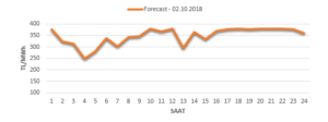 Yarından sonraki gün için oluşacak ortalama piyasa takas fiyatı 348,23 TL/MWH olarak tahmin edilmektedir. Buna bağlı olarak günün maksimum fiyatı 379,69 TL/MWh olarak 21:00 – 22:00 saat aralığında, minimum fiyatı 247,57 TL/MWh olarak 03:00 – 04:00 saat aralığında gerçekleşeceği öngörülmektedir. Puant saatlerde (17:00 – 22:00) tahmini ortalama piyasa takas fiyatı ise 378,33 TL/MWh olarak hesaplanabilmektedir. Saatlik oluşacak piyasa takas fiyatı tahminleri aşağıdaki grafikte yer almaktadır.