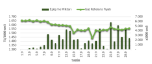 Organize Toptan Doğal Gaz Satış Piyasası (OTSP) dahilinde 01.09.2018 – 30.09.2018 tarihleri arası ortalama Gaz Referans Fiyatı (GRF) 1.576,28 TL/1000 sm3 olarak belirlenirken, aynı tarihler arasında toplam gerçekleşen eşleşmelerin miktarı ise 60.590 x1000 sm3 olarak belirlendi. İlgili tarihler arasında günlük Gaz Referans Fiyatı (GRF) ile Eşleşme Miktarı verileri aşağıdaki grafikte yer almaktadır.