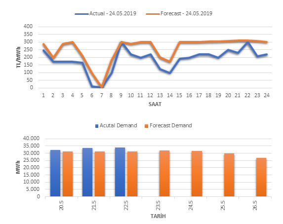 Tahminleme Modeli* analizi sonucu ortalama piyasa takas fiyatı 257.34 TL/MWh ve ortalama tüketim 31,612 MWh olarak öngörülmektedir. Modelin piyasa takas fiyatına dair başarı oranı günlük % 73, tüketime dair başarı oranı** ise günlük % 92 olarak hesaplanırken, bugüne kadar yapılan piyasa takas fiyatına dair analizlere göre başarı oranı % 88, tüketime dair başarı oranı ise % 95 olarak hesaplanmaktadır. Saatlik yarın için oluşan ve tahmin edilen piyasa takas fiyatları ile haftalık bazda tahmin edilen ve gerçekleştikçe yer alacak günlük ortalama tüketim değerleri aşağıdaki grafiklerde yer almaktadır.