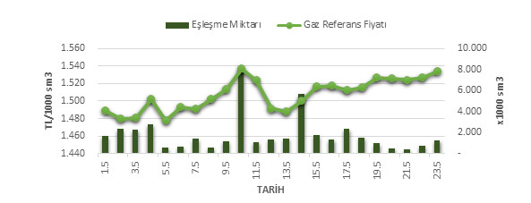 Organize Toptan Doğal Gaz Satış Piyasası (OTSP) dahilinde 01.05.2019 – 23.05.2019 tarihleri arası ortalama Gaz Referans Fiyatı (GRF) 1,507.45 TL/1000 sm3 olarak belirlenirken, aynı tarihler arasında toplam gerçekleşen eşleşmelerin miktarı ise 41,676 x1000 sm3 olarak belirlendi. İlgili tarihler arasında günlük Gaz Referans Fiyatı (GRF) ile Eşleşme Miktarı verileri aşağıdaki grafikte yer almaktadır.