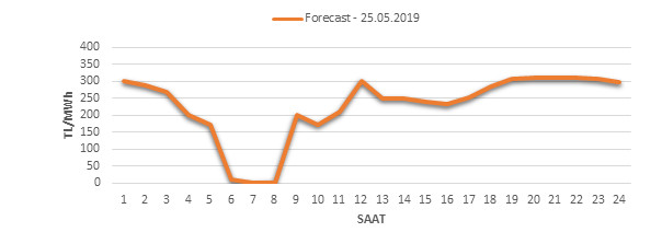 Yarından sonraki gün için oluşacak ortalama piyasa takas fiyatı 228.65 TL/MWH olarak tahmin edilmektedir. Buna bağlı olarak günün maksimum fiyatı 311.03 TL/MWh olarak 21:00 – 22:00 saat aralığında, minimum fiyatı 1.01 TL/MWh olarak 06:00 – 07:00 saat aralığında gerçekleşeceği öngörülmektedir. Puant saatlerde (17:00 – 22:00) tahmini ortalama piyasa takas fiyatı ise 305.3 TL/MWh olarak hesaplanabilmektedir. Saatlik oluşacak piyasa takas fiyatı tahminleri aşağıdaki grafikte yer almaktadır.