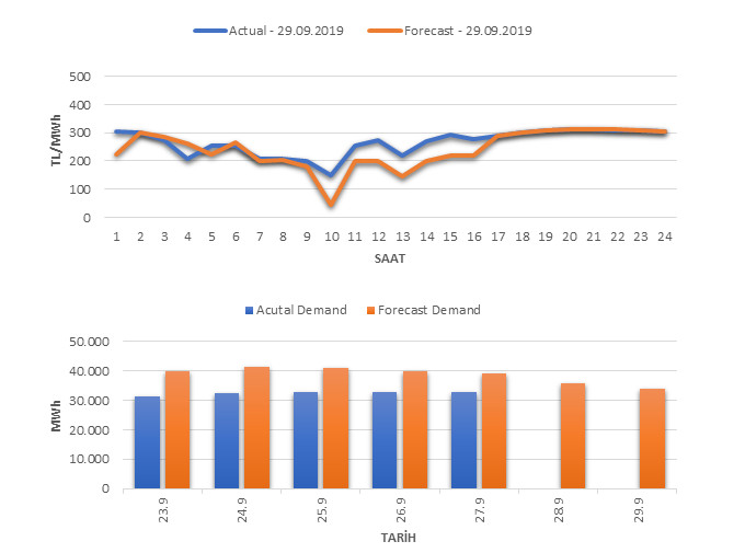 Tahminleme Modeli* analizi sonucu ortalama piyasa takas fiyatı 243.08 TL/MWh ve ortalama tüketim 34,078 MWh olarak öngörülmektedir. Modelin piyasa takas fiyatına dair başarı oranı günlük % 72, tüketime dair başarı oranı** ise günlük % 81 olarak hesaplanırken, bugüne kadar yapılan piyasa takas fiyatına dair analizlere göre başarı oranı % 91, tüketime dair başarı oranı ise % 94 olarak hesaplanmaktadır. Saatlik yarın için oluşan ve tahmin edilen piyasa takas fiyatları ile haftalık bazda tahmin edilen ve gerçekleştikçe yer alacak günlük ortalama tüketim değerleri aşağıdaki grafiklerde yer almaktadır.