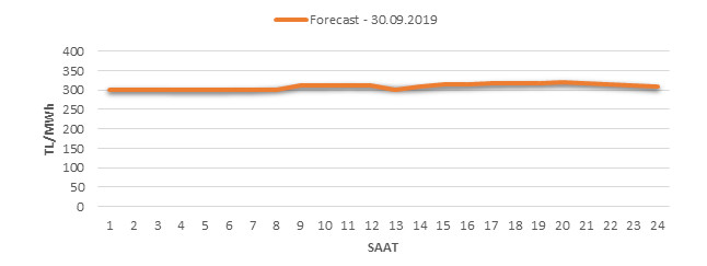 Yarından sonraki gün için oluşacak ortalama piyasa takas fiyatı 309.31 TL/MWH olarak tahmin edilmektedir. Buna bağlı olarak günün maksimum fiyatı 319.42 TL/MWh olarak 19:00 – 20:00 saat aralığında, minimum fiyatı 300.63 TL/MWh olarak 04:00 – 05:00 saat aralığında gerçekleşeceği öngörülmektedir. Puant saatlerde (17:00 – 22:00) tahmini ortalama piyasa takas fiyatı ise 316.46 TL/MWh olarak hesaplanabilmektedir. Saatlik oluşacak piyasa takas fiyatı tahminleri aşağıdaki grafikte yer almaktadır.