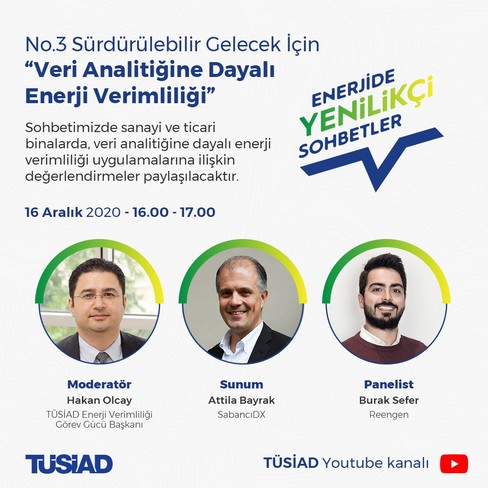 TÜSİAD Enerji Çalışma Grubu’nun düzenlediği “Enerjide Yenilikçi Sohbetler” webinar serisinin 3’üncü etkinliği “Veri Analitiğine Dayalı Enerji Verimliliği” temasıyla 16 Aralık 2020 Çarşamba, saat 16:00’da gerçekleştiriliyor.