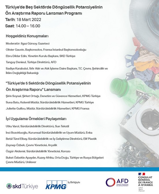 Fransız Kalkınma Ajansı (AFD) tarafından sağlanan fon desteği, İş Dünyası ve Sürdürülebilir Kalkınma Derneği (SKD Türkiye), KPMG Türkiye ve KPMG Fransa iş birliği ile hazırlanan “Türkiye’de 5 Sektörde Döngüsellik Potansiyelinin Ön Araştırma Projesi” sonuçlarının yer aldığı raporun lansmanı, 18 Mart Cuma günü saat 14.00 – 16.00 arasında gerçekleştirilecek.