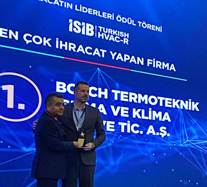 Üstün teknolojiler üreten ve geliştiren, kullanıcılarının ihtiyacı için yüksek verimli sistem çözümleri sunan Bosch Termoteknik, her yıl artan düzeydeki ihracatıyla Türkiye ekonomisine katma değer sağlamaya devam ediyor. İklimlendirme Sanayi İhracatçıları Birliği’nin (İSİB), 2021 yılı ihracatında başarı gösteren firmaları ödüllendirdiği törende Bosch Termoteknik, 2021 yılındaki başarılı ihracat performansıyla ‘2021 yılı en çok İhracat Yapan Firma ve En Çok Kombi-Su Isıtıcısı İhracatı Yapan Firma’ kategorilerinde birinci oldu. Ödülü, Bosch Termoteknik adına, Satış Genel Müdürü Kıvanç Arman, İSİB Başkanı Mehmet Şanal‘ın elinden aldı.