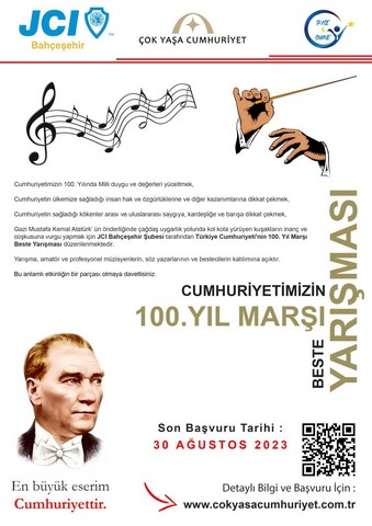 Uluslararası sivil toplum kuruluşu JCI bünyesindeki Genç Liderler ve Girişimciler Derneği Bahçeşehir Şubesi Türkiye Cumhuriyeti’nin kuruluşunun 100. yılına özel olarak “JCI 100. Yıl Marşı Beste Yarışması” düzenliyor. Başvurular 30 Ağustos’a kadar devam edecek.
