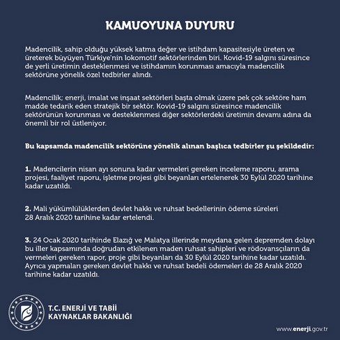 1- Madencilerin nisan ayı sonuna kadar vermeleri gereken inceleme raporu, arama projesi, faaliyet raporu, işletme projesi gibi beyanları ertelenerek 30 Eylül 2020 tarihine kadar uzatıldı.