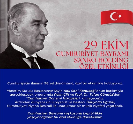 Bu özel etkinlik, 28 Ekim 2021 Perşembe günü saat 17.30’da Gaziantep’te yer alan Tarihi Emine Hanım Konağı’nda gerçekleşerek SANKO Holding kurumsal Youtube hesabından canlı olarak yayınlanacak. SANKO Holding, Cumhuriyet Bayramı coşkusunu yaşamak ve bu özel etkinliğe şahit olmak isteyen herkesi yayını izlemeye davet ediyor.