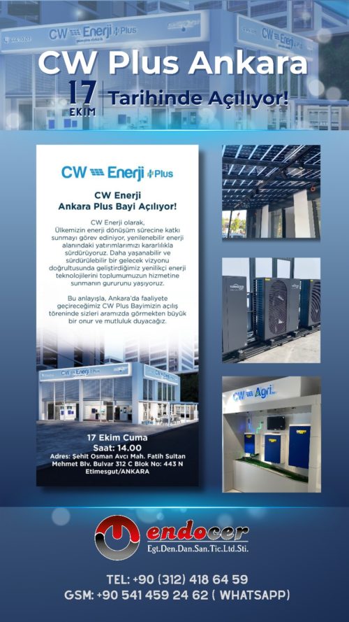 Ankara’da ilk kez; güneş enerji sistemleri, ısı pompaları, akıllı ev sistemleri ekipman ve kurulumlarının olduğu CW ENERJİ Showroom açılışı 17 Ekim 2025 tarihinde yapılacaktır.