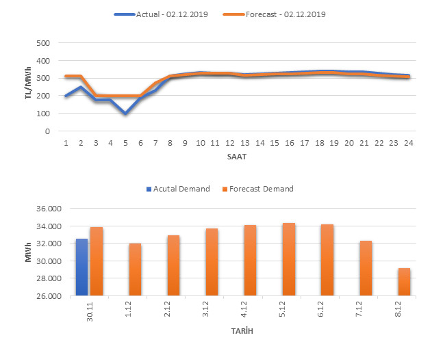 Tahminleme Modeli* analizi sonucu ortalama piyasa takas fiyatı 298.61 TL/MWh ve ortalama tüketim 32,907 MWh olarak öngörülmektedir. Modelin piyasa takas fiyatına dair başarı oranı günlük % 85, tüketime dair başarı oranı** ise günlük % 96 olarak hesaplanırken, bugüne kadar yapılan piyasa takas fiyatına dair analizlere göre başarı oranı % 91, tüketime dair başarı oranı ise % 93 olarak hesaplanmaktadır. Saatlik yarın için oluşan ve tahmin edilen piyasa takas fiyatları ile haftalık bazda tahmin edilen ve gerçekleştikçe yer alacak günlük ortalama tüketim değerleri aşağıdaki grafiklerde yer almaktadır.