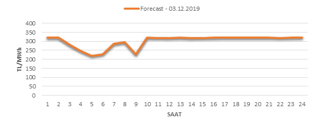 Yarından sonraki gün için oluşacak ortalama piyasa takas fiyatı 299.9 TL/MWH olarak tahmin edilmektedir. Buna bağlı olarak günün maksimum fiyatı 319.89 TL/MWh olarak 16:00 – 17:00 saat aralığında, minimum fiyatı 219.99 TL/MWh olarak 04:00 – 05:00 saat aralığında gerçekleşeceği öngörülmektedir. Puant saatlerde (17:00 – 22:00) tahmini ortalama piyasa takas fiyatı ise 319.08 TL/MWh olarak hesaplanabilmektedir. Saatlik oluşacak piyasa takas fiyatı tahminleri aşağıdaki grafikte yer almaktadır.