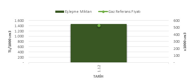 Organize Toptan Doğal Gaz Satış Piyasası (OTSP) dahilinde 01.12.2019 – 01.12.2019 tarihleri arası ortalama Gaz Referans Fiyatı (GRF) 1,408.64 TL/1000 sm3 olarak belirlenirken, aynı tarihler arasında toplam gerçekleşen eşleşmelerin miktarı ise 550 x1000 sm3 olarak belirlendi. İlgili tarihler arasında günlük Gaz Referans Fiyatı (GRF) ile Eşleşme Miktarı verileri aşağıdaki grafikte yer almaktadır.