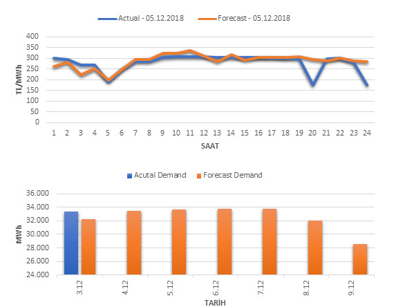Tahminleme Modeli* analizi sonucu ortalama piyasa takas fiyatı 288.14 TL/MWh ve ortalama tüketim 33,641 MWh olarak öngörülmektedir. Modelin piyasa takas fiyatına dair başarı oranı günlük % 72, tüketime dair başarı oranı** ise günlük % 97 olarak hesaplanırken, bugüne kadar yapılan piyasa takas fiyatına dair analizlere göre başarı oranı % 87, tüketime dair başarı oranı ise % 93 olarak hesaplanmaktadır. Saatlik yarın için oluşan ve tahmin edilen piyasa takas fiyatları ile haftalık bazda tahmin edilen ve gerçekleştikçe yer alacak günlük ortalama tüketim değerleri aşağıdaki grafiklerde yer almaktadır.