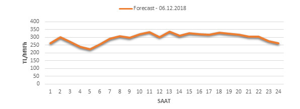 Yarından sonraki gün için oluşacak ortalama piyasa takas fiyatı 296.12 TL/MWH olarak tahmin edilmektedir. Buna bağlı olarak günün maksimum fiyatı 335.21 TL/MWh olarak 12:00 – 13:00 saat aralığında, minimum fiyatı 223.44 TL/MWh olarak 04:00 – 05:00 saat aralığında gerçekleşeceği öngörülmektedir. Puant saatlerde (17:00 – 22:00) tahmini ortalama piyasa takas fiyatı ise 307.97 TL/MWh olarak hesaplanabilmektedir. Saatlik oluşacak piyasa takas fiyatı tahminleri aşağıdaki grafikte yer almaktadır.