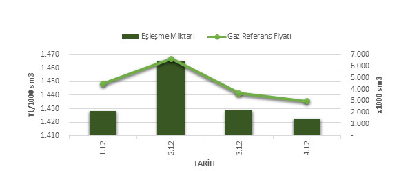 Organize Toptan Doğal Gaz Satış Piyasası (OTSP) dahilinde 01.12.2018 – 04.12.2018 tarihleri arası ortalama Gaz Referans Fiyatı (GRF) 1,448.04 TL/1000 sm3 olarak belirlenirken, aynı tarihler arasında toplam gerçekleşen eşleşmelerin miktarı ise 12,311 x1000 sm3 olarak belirlendi. İlgili tarihler arasında günlük Gaz Referans Fiyatı (GRF) ile Eşleşme Miktarı verileri aşağıdaki grafikte yer almaktadır.