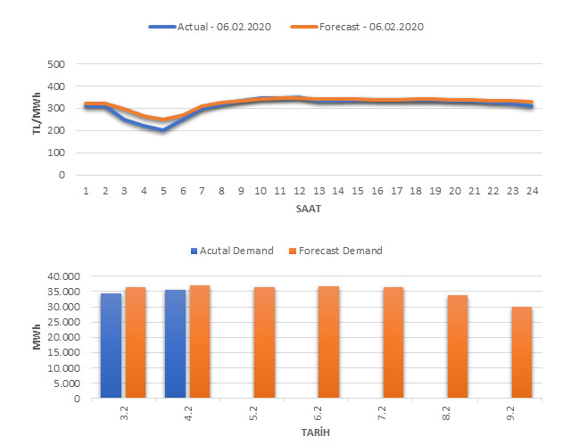 Tahminleme Modeli* analizi sonucu ortalama piyasa takas fiyatı 323.01 TL/MWh ve ortalama tüketim 36,789 MWh olarak öngörülmektedir. Modelin piyasa takas fiyatına dair başarı oranı günlük % 88, tüketime dair başarı oranı** ise günlük % 96 olarak hesaplanırken, bugüne kadar yapılan piyasa takas fiyatına dair analizlere göre başarı oranı % 91, tüketime dair başarı oranı ise % 94 olarak hesaplanmaktadır. Saatlik yarın için oluşan ve tahmin edilen piyasa takas fiyatları ile haftalık bazda tahmin edilen ve gerçekleştikçe yer alacak günlük ortalama tüketim değerleri aşağıdaki grafiklerde yer almaktadır.