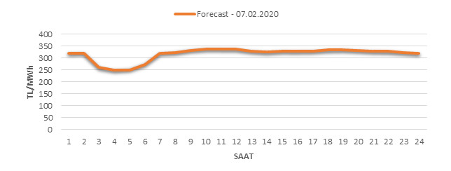 Yarından sonraki gün için oluşacak ortalama piyasa takas fiyatı 316.84 TL/MWH olarak tahmin edilmektedir. Buna bağlı olarak günün maksimum fiyatı 337.5 TL/MWh olarak 09:00 – 10:00 saat aralığında, minimum fiyatı 249 TL/MWh olarak 03:00 – 04:00 saat aralığında gerçekleşeceği öngörülmektedir. Puant saatlerde (17:00 – 22:00) tahmini ortalama piyasa takas fiyatı ise 329.82 TL/MWh olarak hesaplanabilmektedir. Saatlik oluşacak piyasa takas fiyatı tahminleri aşağıdaki grafikte yer almaktadır.