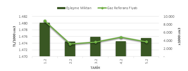 Organize Toptan Doğal Gaz Satış Piyasası (OTSP) dahilinde 01.01.2020 – 05.02.2020 tarihleri arası ortalama Gaz Referans Fiyatı (GRF) 1,475.8 TL/1000 sm3 olarak belirlenirken, aynı tarihler arasında toplam gerçekleşen eşleşmelerin miktarı ise 25,598 x1000 sm3 olarak belirlendi. İlgili tarihler arasında günlük Gaz Referans Fiyatı (GRF) ile Eşleşme Miktarı verileri aşağıdaki grafikte yer almaktadır.