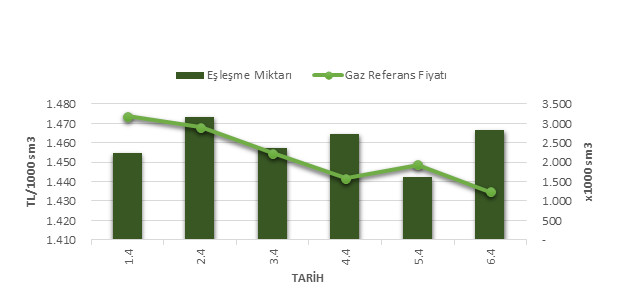 Organize Toptan Doğal Gaz Satış Piyasası (OTSP) dahilinde 01.04.2020 – 06.04.2020 tarihleri arası ortalama Gaz Referans Fiyatı (GRF) 1,453.55 TL/1000 sm3 olarak belirlenirken, aynı tarihler arasında toplam gerçekleşen eşleşmelerin miktarı ise 14,955 x1000 sm3 olarak belirlendi. İlgili tarihler arasında günlük Gaz Referans Fiyatı (GRF) ile Eşleşme Miktarı verileri aşağıdaki grafikte yer almaktadır.