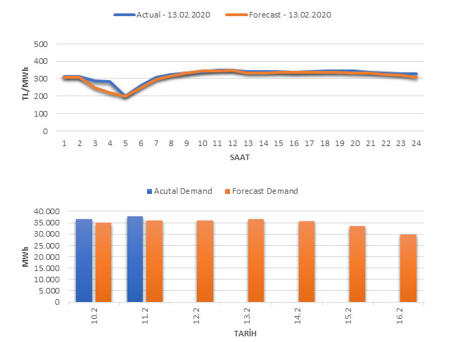 Tahminleme Modeli* analizi sonucu ortalama piyasa takas fiyatı 312.69 TL/MWh ve ortalama tüketim 36,524 MWh olarak öngörülmektedir. Modelin piyasa takas fiyatına dair başarı oranı günlük % 90, tüketime dair başarı oranı** ise günlük % 96 olarak hesaplanırken, bugüne kadar yapılan piyasa takas fiyatına dair analizlere göre başarı oranı % 91, tüketime dair başarı oranı ise % 94 olarak hesaplanmaktadır. Saatlik yarın için oluşan ve tahmin edilen piyasa takas fiyatları ile haftalık bazda tahmin edilen ve gerçekleştikçe yer alacak günlük ortalama tüketim değerleri aşağıdaki grafiklerde yer almaktadır.
