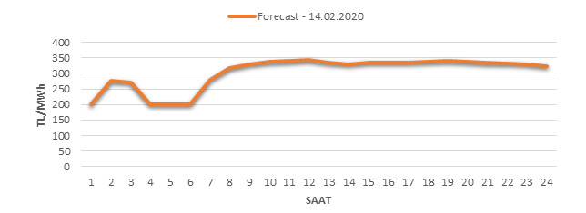 Yarından sonraki gün için oluşacak ortalama piyasa takas fiyatı 305.6 TL/MWH olarak tahmin edilmektedir. Buna bağlı olarak günün maksimum fiyatı 345.4 TL/MWh olarak 11:00 – 12:00 saat aralığında, minimum fiyatı 200 TL/MWh olarak 04:00 – 05:00 saat aralığında gerçekleşeceği öngörülmektedir. Puant saatlerde (17:00 – 22:00) tahmini ortalama piyasa takas fiyatı ise 337.11 TL/MWh olarak hesaplanabilmektedir. Saatlik oluşacak piyasa takas fiyatı tahminleri aşağıdaki grafikte yer almaktadır.