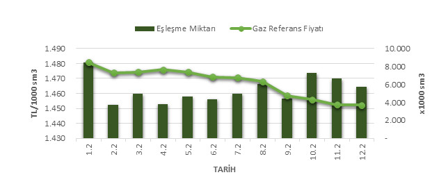 Organize Toptan Doğal Gaz Satış Piyasası (OTSP) dahilinde 01.01.2020 – 12.02.2020 tarihleri arası ortalama Gaz Referans Fiyatı (GRF) 1,467.28 TL/1000 sm3 olarak belirlenirken, aynı tarihler arasında toplam gerçekleşen eşleşmelerin miktarı ise 65,178 x1000 sm3 olarak belirlendi. İlgili tarihler arasında günlük Gaz Referans Fiyatı (GRF) ile Eşleşme Miktarı verileri aşağıdaki grafikte yer almaktadır.