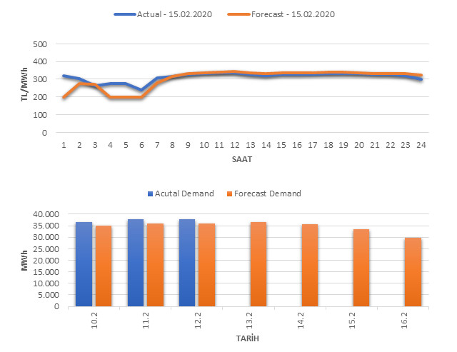 Tahminleme Modeli* analizi sonucu ortalama piyasa takas fiyatı 305.6 TL/MWh ve ortalama tüketim 33,572 MWh olarak öngörülmektedir. Modelin piyasa takas fiyatına dair başarı oranı günlük % 62, tüketime dair başarı oranı** ise günlük % 95 olarak hesaplanırken, bugüne kadar yapılan piyasa takas fiyatına dair analizlere göre başarı oranı % 91, tüketime dair başarı oranı ise % 94 olarak hesaplanmaktadır. Saatlik yarın için oluşan ve tahmin edilen piyasa takas fiyatları ile haftalık bazda tahmin edilen ve gerçekleştikçe yer alacak günlük ortalama tüketim değerleri aşağıdaki grafiklerde yer almaktadır.