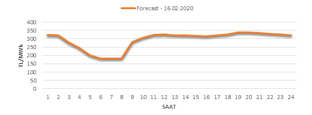 Yarından sonraki gün için oluşacak ortalama piyasa takas fiyatı 293.81 TL/MWH olarak tahmin edilmektedir. Buna bağlı olarak günün maksimum fiyatı 338.62 TL/MWh olarak 19:00 – 20:00 saat aralığında, minimum fiyatı 179.99 TL/MWh olarak 05:00 – 06:00 saat aralığında gerçekleşeceği öngörülmektedir. Puant saatlerde (17:00 – 22:00) tahmini ortalama piyasa takas fiyatı ise 332.34 TL/MWh olarak hesaplanabilmektedir. Saatlik oluşacak piyasa takas fiyatı tahminleri aşağıdaki grafikte yer almaktadır.