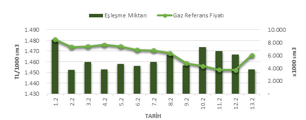 Organize Toptan Doğal Gaz Satış Piyasası (OTSP) dahilinde 01.01.2020 – 14.02.2020 tarihleri arası ortalama Gaz Referans Fiyatı (GRF) 1,467.2 TL/1000 sm3 olarak belirlenirken, aynı tarihler arasında toplam gerçekleşen eşleşmelerin miktarı ise 69,356 x1000 sm3 olarak belirlendi. İlgili tarihler arasında günlük Gaz Referans Fiyatı (GRF) ile Eşleşme Miktarı verileri aşağıdaki grafikte yer almaktadır.