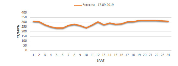 Yarından sonraki gün için oluşacak ortalama piyasa takas fiyatı 286.55 TL/MWH olarak tahmin edilmektedir. Buna bağlı olarak günün maksimum fiyatı 319.6 TL/MWh olarak 19:0020:00 saat aralığında, minimum fiyatı 237.25 TL/MWh olarak 05:0006:00 saat aralığında gerçekleşeceği öngörülmektedir. Puant saatlerde (17:0022:00) tahmini ortalama piyasa takas fiyatı ise 316.01 TL/MWh olarak hesaplanabilmektedir. Saatlik oluşacak piyasa takas fiyatı tahminleri aşağıdaki grafikte yer almaktadır.