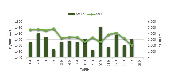 Organize Toptan Doğal Gaz Satış Piyasası (OTSP) dahilinde 01.09.201915.09.2019 tarihleri arası ortalama Gaz Referans Fiyatı (GRF) 1,476.47 TL/1000 sm3 olarak belirlenirken, aynı tarihler arasında toplam gerçekleşen eşleşmelerin miktarı ise 39,856 x1000 sm3 olarak belirlendi. İlgili tarihler arasında günlük Gaz Referans Fiyatı (GRF) ile Eşleşme Miktarı verileri aşağıdaki grafikte yer almaktadır.