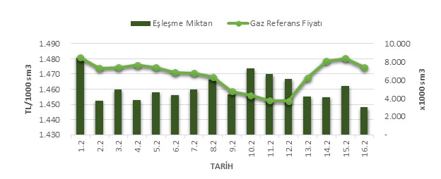 Organize Toptan Doğal Gaz Satış Piyasası (OTSP) dahilinde 01.01.202016.02.2020 tarihleri arası ortalama Gaz Referans Fiyatı (GRF) 1,469.27 TL/1000 sm3 olarak belirlenirken, aynı tarihler arasında toplam gerçekleşen eşleşmelerin miktarı ise 82,227 x1000 sm3 olarak belirlendi. İlgili tarihler arasında günlük Gaz Referans Fiyatı (GRF) ile Eşleşme Miktarı verileri aşağıdaki grafikte yer almaktadır.