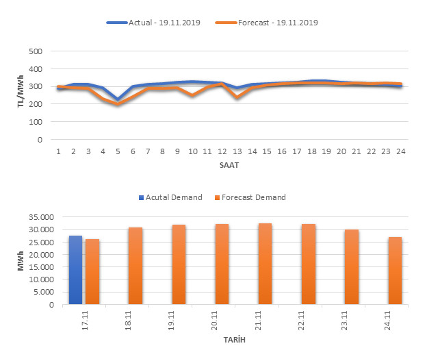 Tahminleme Modeli* analizi sonucu ortalama piyasa takas fiyatı 291.22 TL/MWh ve ortalama tüketim 31,953 MWh olarak öngörülmektedir. Modelin piyasa takas fiyatına dair başarı oranı günlük % 71, tüketime dair başarı oranı** ise günlük % 94 olarak hesaplanırken, bugüne kadar yapılan piyasa takas fiyatına dair analizlere göre başarı oranı % 91, tüketime dair başarı oranı ise % 93 olarak hesaplanmaktadır. Saatlik yarın için oluşan ve tahmin edilen piyasa takas fiyatları ile haftalık bazda tahmin edilen ve gerçekleştikçe yer alacak günlük ortalama tüketim değerleri aşağıdaki grafiklerde yer almaktadır.