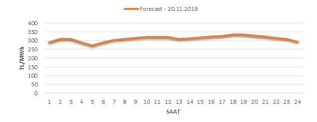 Yarından sonraki gün için oluşacak ortalama piyasa takas fiyatı 312.83 TL/MWH olarak tahmin edilmektedir. Buna bağlı olarak günün maksimum fiyatı 336 TL/MWh olarak 17:00 – 18:00 saat aralığında, minimum fiyatı 271.78 TL/MWh olarak 04:00 – 05:00 saat aralığında gerçekleşeceği öngörülmektedir. Puant saatlerde (17:00 – 22:00) tahmini ortalama piyasa takas fiyatı ise 325.49 TL/MWh olarak hesaplanabilmektedir. Saatlik oluşacak piyasa takas fiyatı tahminleri aşağıdaki grafikte yer almaktadır.