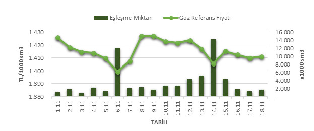 Organize Toptan Doğal Gaz Satış Piyasası (OTSP) dahilinde 01.11.2019 – 18.11.2019 tarihleri arası ortalama Gaz Referans Fiyatı (GRF) 1,415.63 TL/1000 sm3 olarak belirlenirken, aynı tarihler arasında toplam gerçekleşen eşleşmelerin miktarı ise 63,948 x1000 sm3 olarak belirlendi. İlgili tarihler arasında günlük Gaz Referans Fiyatı (GRF) ile Eşleşme Miktarı verileri aşağıdaki grafikte yer almaktadır.
