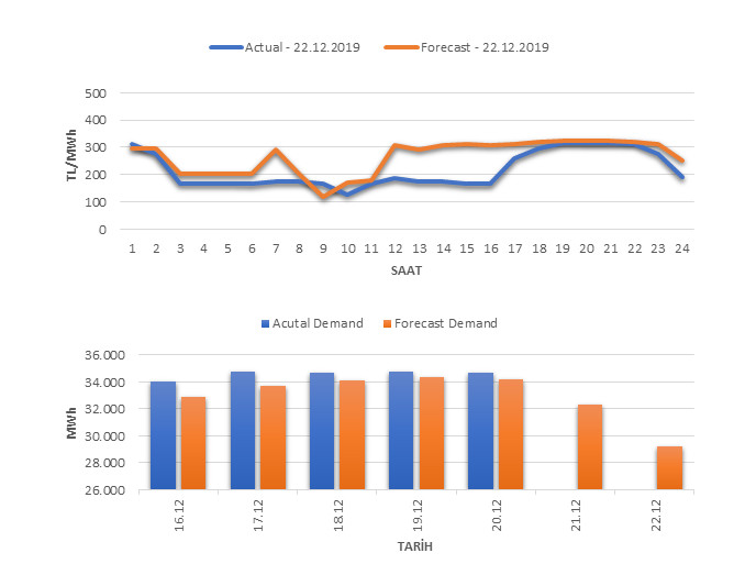 Tahminleme Modeli* analizi sonucu ortalama piyasa takas fiyatı 263.55 TL/MWh ve ortalama tüketim 29,181 MWh olarak öngörülmektedir. Modelin piyasa takas fiyatına dair başarı oranı günlük % 63, tüketime dair başarı oranı** ise günlük % 99 olarak hesaplanırken, bugüne kadar yapılan piyasa takas fiyatına dair analizlere göre başarı oranı % 91, tüketime dair başarı oranı ise % 94 olarak hesaplanmaktadır. Saatlik yarın için oluşan ve tahmin edilen piyasa takas fiyatları ile haftalık bazda tahmin edilen ve gerçekleştikçe yer alacak günlük ortalama tüketim değerleri aşağıdaki grafiklerde yer almaktadır.