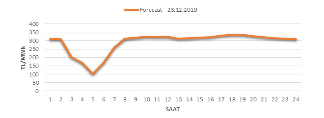 Yarından sonraki gün için oluşacak ortalama piyasa takas fiyatı 289.73 TL/MWH olarak tahmin edilmektedir. Buna bağlı olarak günün maksimum fiyatı 335.01 TL/MWh olarak 17:00 – 18:00 saat aralığında, minimum fiyatı 99.98 TL/MWh olarak 04:00 – 05:00 saat aralığında gerçekleşeceği öngörülmektedir. Puant saatlerde (17:00 – 22:00) tahmini ortalama piyasa takas fiyatı ise 323.73 TL/MWh olarak hesaplanabilmektedir. Saatlik oluşacak piyasa takas fiyatı tahminleri aşağıdaki grafikte yer almaktadır.