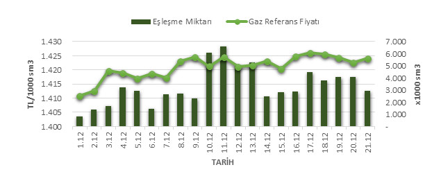 Organize Toptan Doğal Gaz Satış Piyasası (OTSP) dahilinde 01.12.2019 – 21.12.2019 tarihleri arası ortalama Gaz Referans Fiyatı (GRF) 1,420.97 TL/1000 sm3 olarak belirlenirken, aynı tarihler arasında toplam gerçekleşen eşleşmelerin miktarı ise 69,849 x1000 sm3 olarak belirlendi. İlgili tarihler arasında günlük Gaz Referans Fiyatı (GRF) ile Eşleşme Miktarı verileri aşağıdaki grafikte yer almaktadır.