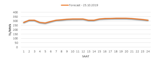 Tahminleme Modeli* analizi sonucu ortalama piyasa takas fiyatı 315.64 TL/MWh ve ortalama tüketim 32,904 MWh olarak öngörülmektedir. Modelin piyasa takas fiyatına dair başarı oranı günlük % 73, tüketime dair başarı oranı** ise günlük % 98 olarak hesaplanırken, bugüne kadar yapılan piyasa takas fiyatına dair analizlere göre başarı oranı % 91, tüketime dair başarı oranı ise % 93 olarak hesaplanmaktadır. Saatlik yarın için oluşan ve tahmin edilen piyasa takas fiyatları ile haftalık bazda tahmin edilen ve gerçekleştikçe yer alacak günlük ortalama tüketim değerleri aşağıdaki grafiklerde yer almaktadır.
