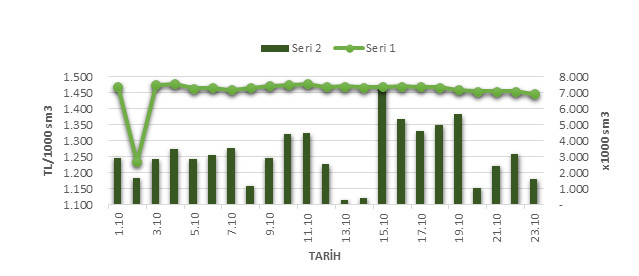 Organize Toptan Doğal Gaz Satış Piyasası (OTSP) dahilinde 01.10.201923.10.2019 tarihleri arası ortalama Gaz Referans Fiyatı (GRF) 1,456.42 TL/1000 sm3 olarak belirlenirken, aynı tarihler arasında toplam gerçekleşen eşleşmelerin miktarı ise 72,804 x1000 sm3 olarak belirlendi. İlgili tarihler arasında günlük Gaz Referans Fiyatı (GRF) ile Eşleşme Miktarı verileri aşağıdaki grafikte yer almaktadır.