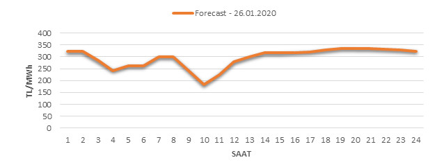 Yarından sonraki gün için oluşacak ortalama piyasa takas fiyatı 297.17 TL/MWH olarak tahmin edilmektedir. Buna bağlı olarak günün maksimum fiyatı 336.17 TL/MWh olarak 19:0020:00 saat aralığında, minimum fiyatı 181.98 TL/MWh olarak 09:0010:00 saat aralığında gerçekleşeceği öngörülmektedir. Puant saatlerde (17:0022:00) tahmini ortalama piyasa takas fiyatı ise 333.34 TL/MWh olarak hesaplanabilmektedir. Saatlik oluşacak piyasa takas fiyatı tahminleri aşağıdaki grafikte yer almaktadır.