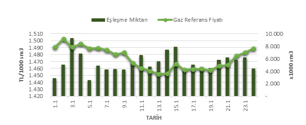 Organize Toptan Doğal Gaz Satış Piyasası (OTSP) dahilinde 01.01.202024.01.2020 tarihleri arası ortalama Gaz Referans Fiyatı (GRF) 1,473.88 TL/1000 sm3 olarak belirlenirken, aynı tarihler arasında toplam gerçekleşen eşleşmelerin miktarı ise 129,335 x1000 sm3 olarak belirlendi. İlgili tarihler arasında günlük Gaz Referans Fiyatı (GRF) ile Eşleşme Miktarı verileri aşağıdaki grafikte yer almaktadır.