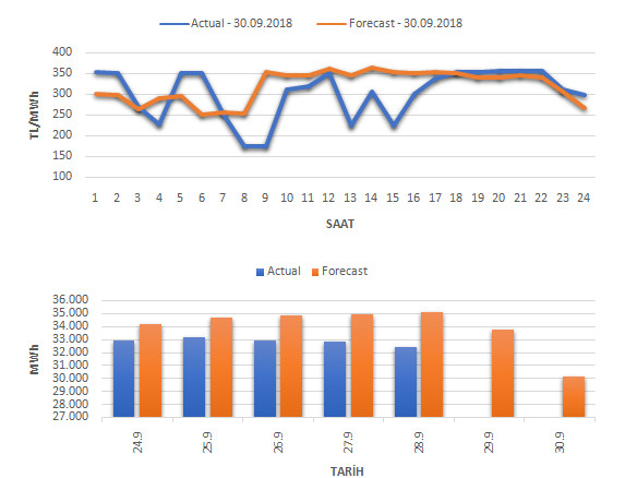 Tahminleme Modeli* analizi sonucu ortalama piyasa takas fiyatı 319,21TL/MWh ve ortalama tüketim 30.148 MWh olarak öngörülmektedir. Modelin piyasa takas fiyatına dair başarı oranı günlük % 64, tüketime dair başarı oranı ise günlük % 92 olarak hesaplanırken, bugüne kadar yapılan piyasa takas fiyatına dair analizlere göre başarı oranı % 80, tüketime dair başarı oranı ise % 91 olarak hesaplanmaktadır. Saatlik yarın için oluşan ve tahmin edilen piyasa takas fiyatları ile haftalık bazda tahmin edilen ve gerçekleştikçe yer alacak günlük ortalama tüketim değerleri aşağıdaki grafiklerde yer almaktadır.