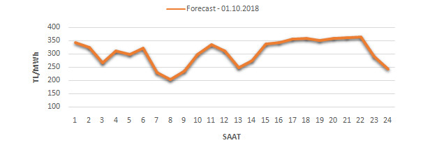 Yarından sonraki gün için oluşacak ortalama piyasa takas fiyatı 306,63TL/MWH olarak tahmin edilmektedir. Buna bağlı olarak günün maksimum fiyatı 364,69TL/MWh olarak 21:00 – 22:00 saat aralığında, minimum fiyatı 203,83 TL/MWh olarak 07:00 – 08:00 saat aralığında gerçekleşeceği öngörülmektedir. Puant saatlerde (17:00 – 22:00) tahmini ortalama piyasa takas fiyatı ise 347,09 TL/MWh olarak hesaplanabilmektedir. Saatlik oluşacak piyasa takas fiyatı tahminleri aşağıdaki grafikte yer almaktadır.