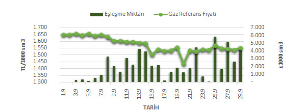 Organize Toptan Doğal Gaz Satış Piyasası (OTSP) dahilinde 01.09.2018 – 29.09.2018 tarihleri arasıortalama Gaz Referans Fiyatı (GRF) 1.577,03 TL/1000 sm3olarak belirlenirken, aynı tarihler arasında toplam gerçekleşen eşleşmelerin miktarı ise 58.176 x1000 sm3 olarak belirlendi. İlgili tarihler arasında günlük Gaz Referans Fiyatı (GRF) ile Eşleşme Miktarı verileri aşağıdaki grafikte yer almaktadır.